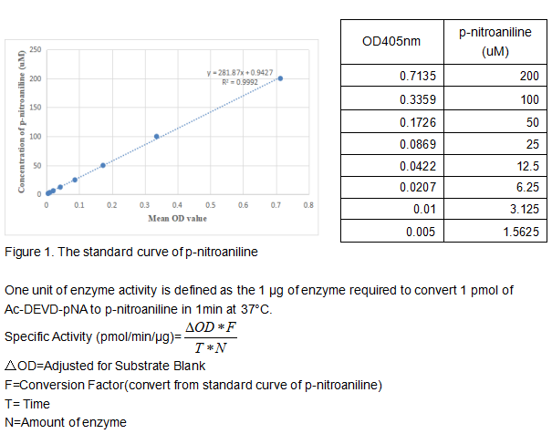 Caspase 3 is a member of the cysteine-aspartic acid protease (caspase) family. Sequential activation of caspases plays a central role in the execution-phase of cell apoptosis. Caspases exist as inactive proenzymes that undergo proteolytic processing at conserved aspartic residues to produce two subunits, large and small, that dimerize to form the active enzyme. This protein cleaves and activates caspase 6 and 7; and the protein itself is processed and activated by caspases 8, 9, and 10. Caspase 3 can hydrolyze the peptide substrate acetyl-Asp-Glu-Val-Asp-p-nitroanilide (Ac-DEVD-pNA) resulting in the release of the p-nitroaniline (pNA) moiety. p-Nitroaniline has a high absorbance at 405 nm. Thus the activity of recombinant mouse caspase 3 can be measured by calculating the concentration of the pNA released from the substrate. The reaction was performed in adding 50 μl 2×buffer (50mM HEPES,100mM NaCl,10mM DTT, 2mM EDTA, 10% glycerol) to 96 well plates, then add 50 μl various concentrations of caspase 3 (diluted by 1×buffer, 25mM HEPES, 50mM NaCl, 5mM DTT, 1mM EDTA, 5% glycerol, pH 7.4) to each well, finally, add 5 μl 4mM Ac-DEVD-pNA to each well. Cover the 96 well plates and incubate at 37 ℃ for 1h. p-Nitroaniline (pNA) Standard curve prepare by double dilute 200 μM pNA with 1×buffer and record the OD value at 405 nm. The specific activity of recombinant mouse caspase3 is >3000 pmol/min/μg.